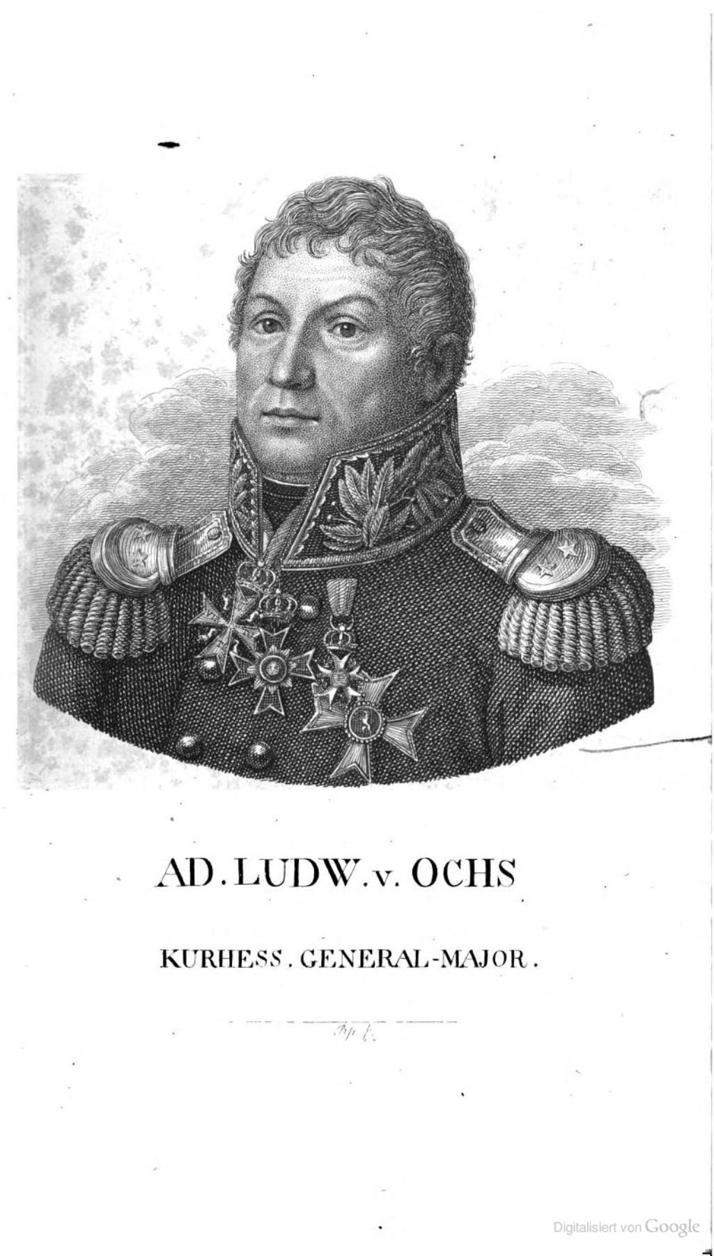 Adam Ludwig von Ochs was born on 24 May 1759 in Rosenthal. He entered military service in April 1777 in the Hessian Feldjägerkorps as a Fourier. He served in the American Revolutionary War under Oberst von Wurmb, was promoted to officer on 7 September 1781, and served as Leutnant and adjutant during the campaigns in America. He returned to Europe in 1784. He became Stabscapitän on 11 October 1788 and as the war of 1792 began he commanded a company under his Landgrave in Champagne, participating in the allied assembling near Koblenz. In 1793 during operations against Dunkirk he was detached across the Lys into the enemy rear. In 1798 he helped develop a new Hessian infantry service and drilling regulation, and in 1799 he was promoted to Major and made commander of a Jägerbataillon. On 14 September 1794 he was publicly commended for his conduct at the action at Boxtet. He was elevated to the nobility in 1802 by imperial decree.